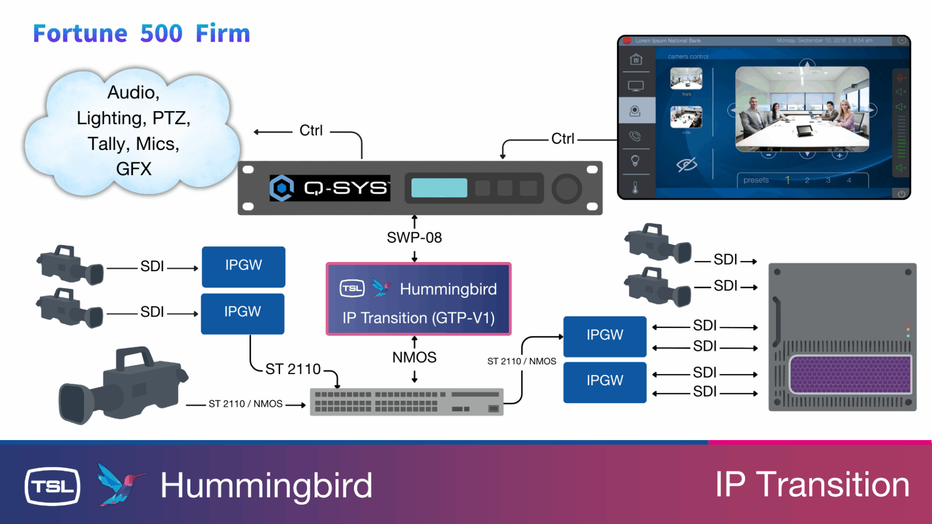 TSL’s Hummingbird X-Connect ST 2110 routing solution effortlessly connects and controls IP edge devices and legacy broadcast devices, bridging the integration gap between SDI and IP-based workflows.