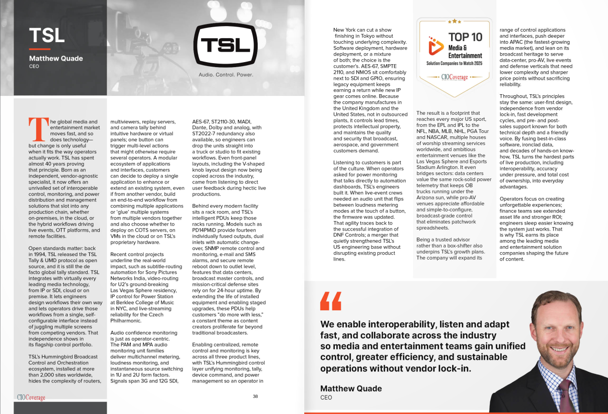 TSL appears in CIO Magazine’s annual list of leading Media and Entertainment Solution Companies, featured alongside industry names such as Grass Valley, Chyron and Dalet. The issue highlights vendors shaping the next chapter of media technology and showcases organisations delivering practical innovation for real workflow and production challenges.